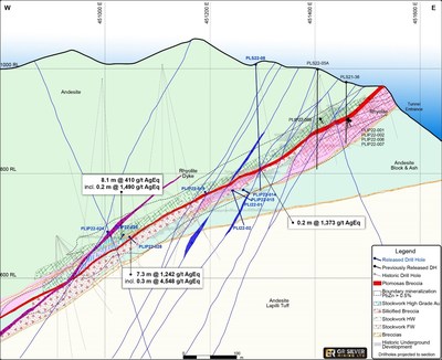 PLI22-12: 5.7 m at 514 g/t Ag, 0.1 g/t Au, 0.4% Pb and 0.5% Zn including 1.0 m at 1,634 g/t Ag, 0.28 g/t Au, 1.2% Pb and 1.0% Znincluding 0.2 m at 3,163 g/t Ag, 0.61 g/t Au, 2.5% Pb and 4.3% ZnPLIP22-28: 7.3 m at 55 g/t Ag, 8.66 g/t Au, 2.7% Pb, 6.6% Zn and 0.5% Cuincluding 0.3 m at 190 g/t Ag, 44.4 g/t Au, 1.3% Pb, 2.1% Zn and 1.0% CuPLIP22-18: 5.0 m at 88 g/t Ag, 0.33 g/t Au, 5.1% Pb, 2.8% Zn and 0.2% CuPLS22-08: 21.2 m at 2.1% Pb and 1.3% Zn The Company's underground drilling and mapping program, currently in progress in the Plomosas Mine Area, has identified un-mined zones that will be incorporated into the upcoming resource estimate, as well as better delineating the precious metals-rich stockwork zones located on the hanging wall of the hydrothermal breccia and often associated with NW-trending fault zones. Since completion of the NI 43-101 (see News Release dated August 23, 2021), the Company has added 4,946 m of drilling at the Plomosas Mine Area. This represents a significant addition of results still to be incorporated into the upcoming resource model and estimate.