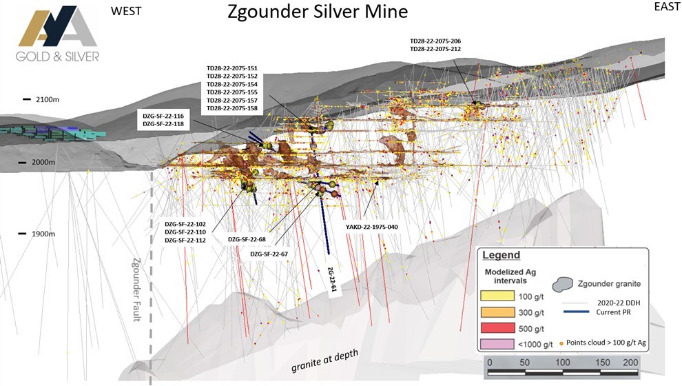 Figure 1: Location of DDH Results at Zgounder (CNW Group/Aya Gold & Silver Inc) High-grade definition of working galleries just below the 2,075-meter ("m") level with TD-22-2075-155, which intercepted 7,480 grams per tonne ("g/t") silver ("Ag") over 4.8m including16,320 g/t Ag over 1.2m11,750 g/t Ag over 1.2m and with TD28-22-2075-158, which intercepted 1,094 g/t Ag over 4.8m including