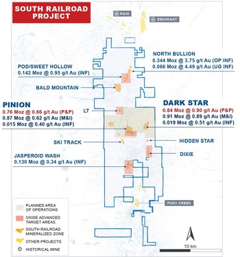 With respect to the South Railroad Project, the mineral reserve estimate for: (i) Dark Star consists of 283 koz gold of proven reserves (6,911 k tonnes at 1.27 g/t) and 557 koz gold of probable reserves (22,247 k tonnes at 0.78 g/t); and (ii) Pinion consists of 50 koz gold of proven reserves (2,049 k tonnes at 0.76 g/t) and 714 koz gold of probable resources (33,992 k tonnes at 0.65 g/t). The mineral resource estimate for (i) Dark Star consists of 288 koz gold of measured resources (7,225 k tonnes at 1.24 g/t), 625 koz gold of indicated resources (24,567 k tonnes at 0.79 g/t) and 19 koz gold of inferred resources (1,176 k tonnes at 0.51 g/t); (ii) Pinion consists of 55 koz gold of measured resources (2,336 k tonnes at 0.73 g/t), 816 koz gold of indicated resources (41,193 k tonnes at 0.62 g/t) and 15 koz gold of inferred resources (1,178 k tonnes at 0.40 g/t); (iii) Jasperoid Wash consists of 130 koz gold of inferred resources (11,939 k tonnes at 0.34 g/t); (iv) POD / Sweet Hollow consists of 142 koz gold of inferred resources (4,654 k tonnes at 0.95 g/t); (v) North Bullion Open Pit consists of 344 koz gold of inferred resources (2,849 k tonnes at 3.75 g/t); and (vi) North Bullion Underground consists of 66 koz gold of inferred resources (457 k tonnes at 4.49 g/t). For additional detail, see the South Railroad Feasibility Study (as defined below). Mineral resources are inclusive of mineral reserves.