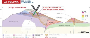 Program: Two diamond drill core holes, totalling 540 metres, have been completed at La Pelona. These two drill holes followed up on historical diamond drill holes that returned lower grade oxide gold intersections of 0.15 to 0.41 g/t over large drill intervals ranging from 76 to 144 metres.