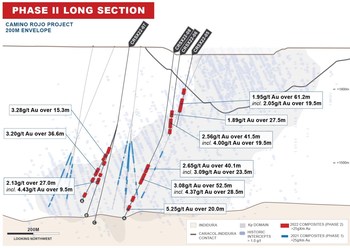 Results and Next Steps: This current Phase 2 drilling continues to return wide, higher-grade intercepts of gold mineralization associated with identifiable structures in the deposit. The improved understanding of grade distribution and continuity is critical to the progress of the Camino Rojo Sulphide project and will be reflected in an updated resource model. Selected significant results from five holes with assays received out of the 15 holes planned in 2022 include: