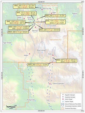 The Cobra Zone has over 8 kilometers of known strike extent, from Menankoto South to the southern end of the Bakolobi permit. The Cobra Zone is being targeted as a source of additional sulphide mineralization within the Anaconda Area. Recent drilling highlights include hole MSD_227, which intersected 2.02 g/t gold over 25.30 m (approximately 20 m true width) from 201.70 m, and 6.75 g/t gold over 13.80 m from 244.40 m, confirming the potential for economic grade and width combinations in the sulphide mineralization. Closer to surface, hole MSR_959 intersected 3.33 g/t gold over 12.00 m from 107.00 m in saprolite mineralization. The Company believes that the Cobra Zone may extend onto the Bakolobi permit and are currently drilling this extension target.