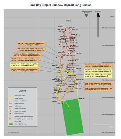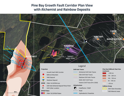 VANCOUVER, BC, Sept. 19, 2022 /CNW/ - Callinex Mines Inc. (the "Company" or "Callinex") ( TSXV: CNX) (OTCQX: CLLXF) is pleased to announce initial results from of the fully funded 2022 exploration campaign to expand and delineate the high-grade copper, gold, silver and zinc Rainbow deposit (the "Rainbow") and test new target areas. The Rainbow is located at the 100% owned Pine Bay Project within a mineral lease, less than 250m from a high-voltage hydroelectric power-line, 550m from a historic shaft with direct road access to processing facilities in Flin Flon, Manitoba and 1.4km from the newly discovered Alchemist deposit ( Pine Bay Project Plan View) ( See news release dated September 7, 2022).