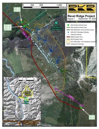 VANCOUVER, BC, Sept. 26, 2022 /CNW/ - Rokmaster Resources Corp. ( TSXV: RKR) (OTCQB: RKMSF) (FSE: 1RR1) ("Rokmaster" or "the Company") is pleased to announce the successful extension of the Revel Ridge Main Zone ("RRMZ") a further 925 m to the southeast and 290 m to the northwest, in addition to initial assay results of the ongoing summer 2022 diamond drill program at the Revel Ridge Project ("Revel Ridge" or "the Project").