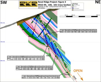 | Drillholes RR22-99 and RR22-101 achieved strong RRMZ intersections as the deformation zone dilated at a favourable limestone-quartzite contact ( Figure 3 – Cross Section). Each drillhole also encountered Revel Ridge Yellowjacket Zone ("RRYZ") approximately 30 m in the hanging wall to the RRMZ. This is a significant expansion of the RRYZ, with a distance of ~115 m between drillholes RR21-50 and RR22-99. Assay results for RR22-102a to RR22-105 are pending and will be reported when received.