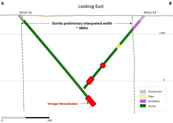 Three holes (REI22-12, REI22-13, REI22-15) were drilled in the north limb with all holes intersecting the targeted mineralized dunite. REI22-13 intersected the typical differentiation sequence, collaring in gabbro and followed by pyroxenite, peridotite and dunite. The hole finished in dunite.