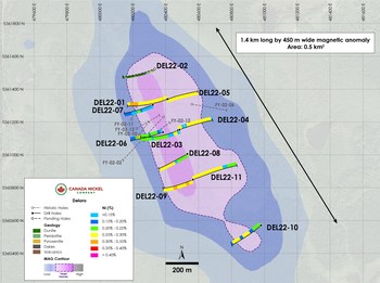 Current drilling confirms large scale discovery at Reid – delineated mineralized footprint already 90% of Crawford footprint of 1.6 km2 which contains the fifth largest Measured & Indicated sulphide resource globally of 3.5 million tonnes of contained nickelRegional drilling continues to validate geophysical targeting approach highlighting potential from 42 km2 of geophysical targetsLatest assays from Deloro include DEL22-05 intersecting 394 metres of 0.26% nickel