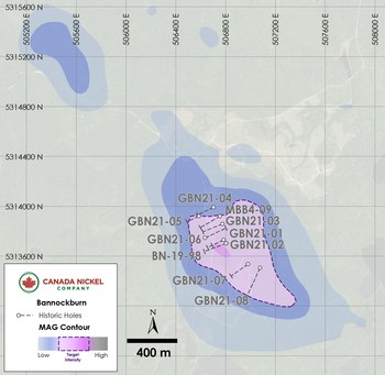Figure 7 – Bannockburn “B Zone” – Historical Drillholes Over Total Magnetic Intensity. (CNW Group/Canada Nickel Company Inc.)