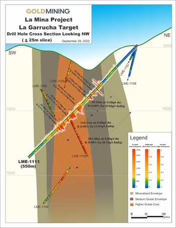 Alastair Still, CEO, commented, "The 2022 drilling program has successfully discovered extensions of previously identified gold-copper porphyry mineralization at the La Garrucha target and has almost doubled the strike and depth of the system, which remains open to the southeast and at depth. The latest drill results help demonstrate the geological continuity and higher-grade core of this mineralized system. These results along with drilling from historic exploration programs will be used to initiate an updated mineral resource estimate for the La Mina Project in the fourth quarter of 2022 with the intention to complete an updated Preliminary Economic Assessment ("PEA") in 2023."