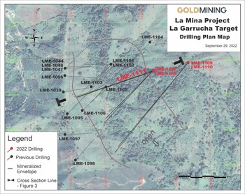 Drill Program Details and Geological Description From late March through to mid-August 2022, GoldMining completed a diamond core drilling program comprising five drill holes for 3,485 m at its La Garrucha target within the La Mina Project (see Figures 1 & 2). Comprehensive assay intercepts for the entire drill program, including the last hole of program LME1111, can be found in Table 1.