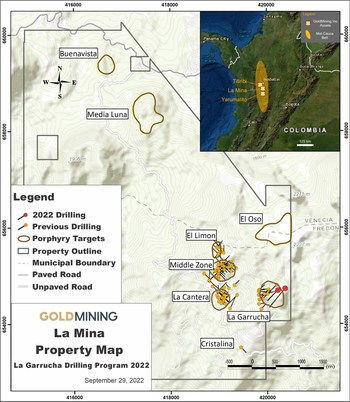 VANCOUVER, BC, Sept. 29, 2022 /CNW/ - GoldMining Inc. (the "Company" or "GoldMining") (TSX: GOLD) (NYSE American: GLDG) is pleased to announce assay results from the final hole of its recently completed five hole 3,485 metre drilling program on the La Garrucha target, located less than one kilometre to the east of existing mineral resources on the Company's 100% owned La Mina Project ("La Mina") in the Middle Cauca Porphyry Belt, Antioquia, Colombia.