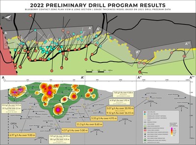 | President and CEO, Brad Rourke: "Mapping and bedrock sampling in 2021 indicated that the andesite-siltstone contact that defines the Blueberry Contact Zone continues south underneath the Summit Lakebed, and outcrops hundreds of metres south along the contact from previous drilling. The intersection of high-grade mineralization in hole SR22-169 at the lithological contact illustrates that the gold-bearing Blueberry Contact Zone does not diminish to the south, increasing the known strike length of the system to 1,200 metres. Additional assays are pending on drill holes that could further extend mineralization 350 metres to the south, and initial visuals from the holes are encouraging. Our 2022 program has already demonstrated tremendous success with large step outs on the structure intersecting wide zones of high-grade mineralization. Both the large step-outs and the consistency of drilled intercepts, support the potential a of multi-million ounce deposit at the Blueberry Contact Zone."