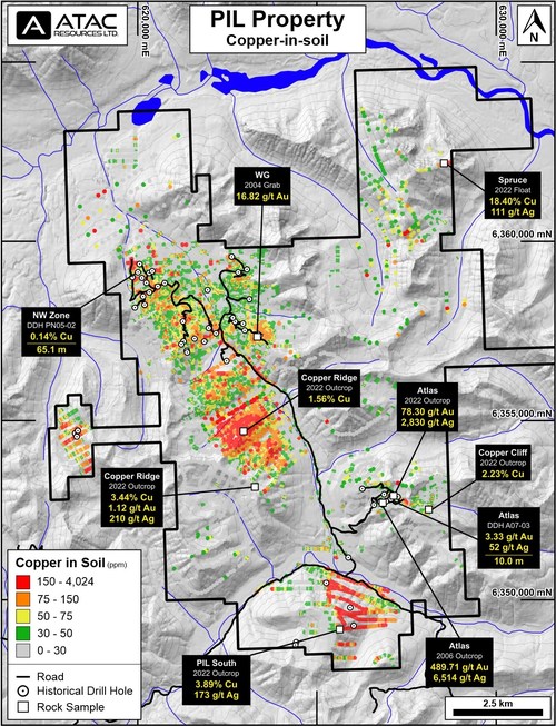 Crews have recently completed a Phase 2 program including additional prospecting at PIL South and re-sampling of historical Atlas drill core. "This initial program at PIL has defined a number of priority targets for follow-up work," stated ATAC's president and CEO, Graham Downs. "Sampling at Spruce returned the highest copper grades ever collected on the property. The Atlas target shows strong potential for high grade epithermal gold-silver mineralization. PIL South has an extensive copper-in-soil response that is now coupled with strong copper mineralization in outcrop samples. We're very pleased with our initial work at PIL and anticipate receiving a 3-year Notice of Work later this fall, which will allow us to ramp up work to drilling in future seasons."