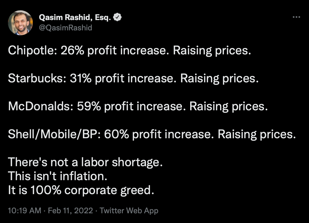 2. The truth today is that Corporate America has purposefully created this inflation “crisis” by taking advantage of the pandemic and the war as an excuse to raise prices on the average consumer. The result: Less money in the average person’s pocket — and record profits posted by numerous companies over the past two years. It’s been one of the biggest ruses in history. Republicans, having pledged their loyalty to make the 1% richer, are counting on us being too stupid to figure it out.