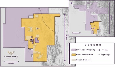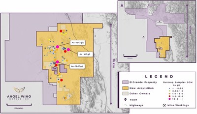 "The Angel Wing Metals team is excited to have acquired the 102 km2 La Reyna claim group as part of the district scale consolidation of the historic Aguilas de Oro mining district containing multiple alteration zones in a highly prospective underexplored part of the SMO, with it's well-known mineral potential and mining history. We have already Identified prospective geology with multiple drill-ready targets. The newly acquired La Reyna claims increase the El Grande Project to over 650 sq km2, covering an area slightly greater than that of Metro Toronto." stated Bryan Wilson, President and CEO of Angel Wing Metals Inc.