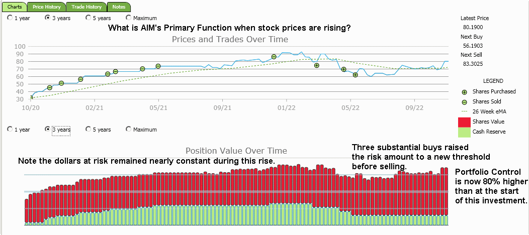 This histogram shows that AIM ability quite nicely. During the rising price period AIM took profits and capped the dollars at risk nicely. Then when the buying started, through the rise in Portfolio Control from those buys a new maximum risk amount was established. Right now the price/share of that equity is rapidly approaching the point where AIM will again cap the dollars at risk and start to sideline cash. The price/share is just 3.5% below the Next Sell price as of this AM.