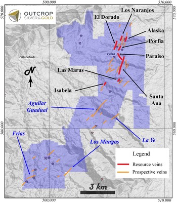 Outcrop will continue with its regional target definition and drilling in numerous targets along the mapped mineralized trend (see news release dated August 23, 2022) from the Aguilar-Guadual vein systems along 8.5-kilometres to the Frias mine group of veins. (Figure 4).