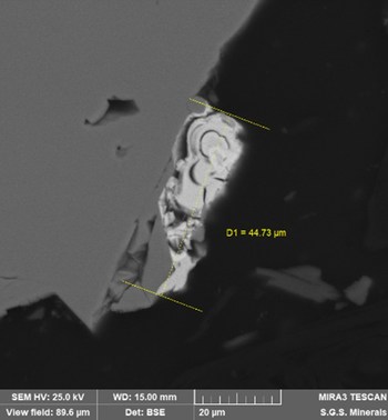 Mineral characterization during testing has shown electrum (Figure 2) to contain 60 to 70% silver (with gold) and represents, on average, 3% of the silver-forming mineral mass. Argentite is the most common silver-phase mineral, with 88% of the total mass, followed by Freibergite, with 8% of the mass on average. Mineralogy is simple, with silver partitioned into mainly three minerals.