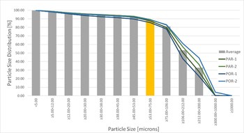 Figure 1. Particle size mass distribution for all sulfide phases. Yellow highlight indicates 90% liberation between 53 and 75 microns, a good size distribution for processing. (CNW Group/Outcrop Silver & Gold Corporation)
