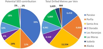 Mineral Resource Guidance and future potential Outcrop maintains an internal guidance of 45 to 55 million silver equivalent ounces (see news release dated January 25, 2022), incorporating twelve shoots from the eight most well-defined veins on the Santa Ana project (Figure 3 and Figure 4). The Megapozo shoot (Paraiso vein) and the Ivana shoot (Porfia vein) represent more than 50% of the potential resources (Figure 3). The mineral resource estimate will incorporate 44,608 metres of drilling in 238 drill holes distributed in the eight shoots (Figure 3).