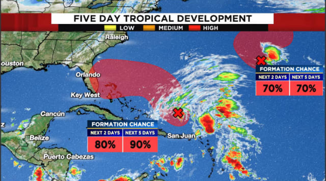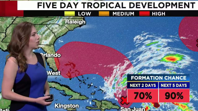 As of 1 p.m. Sunday, the NHC gave Invest 98L an 80% chance of tropical development in the next two days, 90% in the next five.