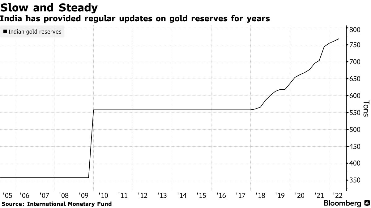 IndiaIndia’s central bank has made large gold purchases before, buying 200 tons from the International Monetary Fund in 2009. Since then it’s tended to buy more gradually, while providing timely updates to the market.