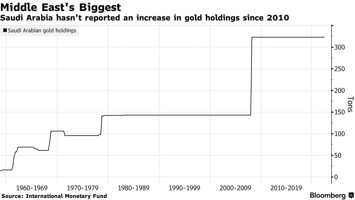 They may have looked to gold to diversify. Saudi Arabia has the biggest gold hoard in the Arab world, but hasn’t reported a change in its holdings since 2010. Back then a “difference in accounting” led to its reserves doubling to 323 tons.