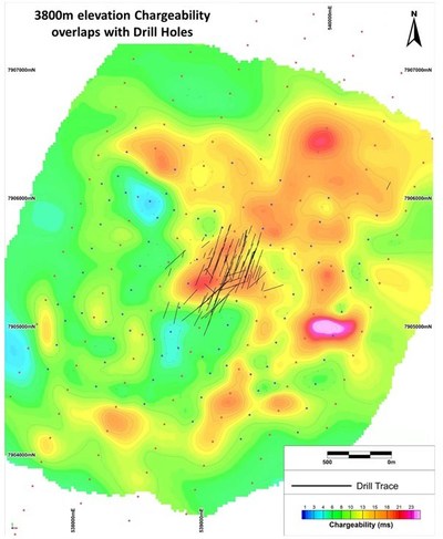 The IP survey also showed that higher chargeability at 3600 m elevation, approximately 350 m below the surface, appears to perfectly coincide with the higher grade gold intercepts at that depth (Figure 2). Previous gold intercepts seem to have hit the east half of the chargeability anomaly at 3600 m elevation. More drill holes are planned to test the west half of this target.