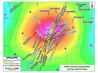 Figure 2 The most prominent high chargeability anomaly at 3600 m elevation perfectly overlays the gold intercepts from drilled holes in the Central Valley area. New drill holes (e.g. DCAr0114) are planned to target the west half of the chargeability anomaly. Based on the chargeability results, gold mineralization may be related to a "plume" type of system.