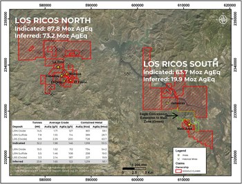 Los Ricos District Exploration Projects The Company's two exploration projects at its Los Ricos Property are in Jalisco state, Mexico. The Los Ricos South Project began in March 2019 and an initial Mineral Resource was announced on July 29, 2020 which disclosed a Measured & Indicated Mineral Resource of 63.7 million ounces AgEq grading 199 g/t AgEq contained in 10.0 million tonnes, and an Inferred Mineral Resource of 19.9 million ounces AgEq grading 190 g/t AgEq contained in 3.3 million tonnes. An initial PEA on the project was announced on January 20, 2021 indicating an NPV5% of US$295M. The Eagle Concession was acquired in October 2022 and is adjacent to the Main Area which contains the initial Mineral Resource.