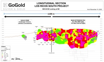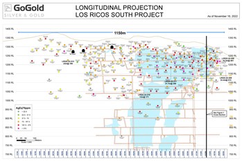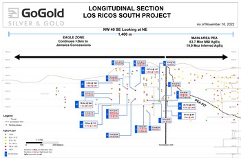 HALIFAX, NS, Nov. 16, 2022 /CNW/ - GoGold Resources Inc. (TSX: GGD) (OTCQX: GLGDF) ("GoGold", "the Company") is pleased to announce drilling results from the Main Deposit within Los Ricos South as well as additional results from the newly acquired Eagle concession, which contains the northern strike extension of the Main Deposit on the Los Ricos South property. Highlights of the Main Deposit drilling include hole LRGG-22-209, which intercepted 11,103 g/t silver equivalent ("AgEq") over 1.0m, contained within 3.0m of 4,852 g/t AgEq within a wider intercept of 33.2m of 513 g/t AgEq. See Table 1 for breakdown of silver and gold values.