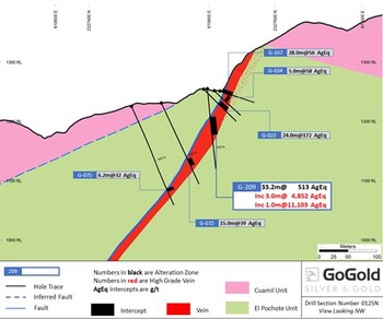 Figure 1: Main Area – Cross Section Hole LRGG-22-209 (CNW Group/GoGold Resources Inc.) Figure 2: Eagle + Main Area Grade Thickness Longitudinal Section (CNW Group/GoGold Resources Inc.) Figure 3: Eagle Longitudinal Section (CNW Group/GoGold Resources Inc.) Figure 4: Main Area Longitudinal Section (CNW Group/GoGold Resources Inc.) Figure 5: Los Ricos District Overview (CNW Group/GoGold Resources Inc.)