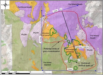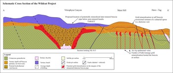 Additional bulk-tonnage gold mineralization associated with tuff breccia may be present elsewhere within the district, particularly beneath a post-mineral mafic volcanic cover sequence and within the interpreted main feeder diatreme. Low-sulphidation epithermal veins beneath the tuff breccia have the potential to host high-grade gold targets. Refer to Figure 4 for a schematic cross section of the Wildcat deposit.