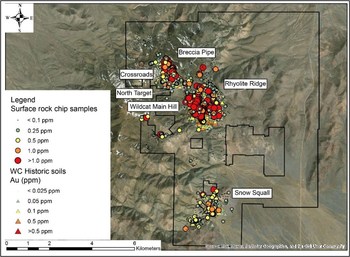 The Rhyolite Ridge Target lies directly east of the Main Hill and presents an opportunity to expand the planned mining area. Soil anomalies returning grades up to 0.23 g/t oxide Au and rock chip samples up to 7.7 g/t oxide Au in historic data indicate mineralization is present. Drilling in proximity to Rhyolite Ridge returned intercepts with grades up to 0.50 g/t oxide Au, which is above the proposed cut-off grade for the Wildcat open pit (described in the November 2020 NI 43-101 Technical Report for the Wildcat Project available on SEDAR). Future exploration and drilling in this area will target silicified rhyolite outcrops and brecciated areas with oxidized sulfides.