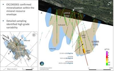 Kilgore Exploration Results To Date 1 The 2022 drill program at Kilgore focused on confirming the historical and reverse circulation intercepts within the Kilgore deposit, and exploring along the trend and at depth while obtaining structural readings from the oriented core throughout the deposit. Diamond drill hole EX22KG001 was a confirmation drillhole within the current mineral resource envelope identified by the previous drilling. A more detailed sampling was conducted, identifying a high level of grade variability, and control of mineralization by narrow jarosite-filled structures and narrow, high-grade vein stockwork.