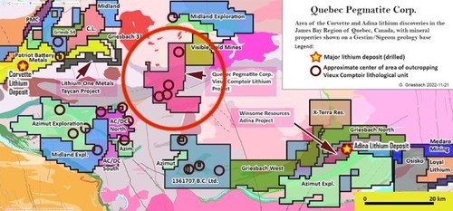 Approximately 45 km east of Patriot Battery Metals Corvette Project where numerous Spodumene bearing pegmatites have been discovered, and recent drilling includes intersections up to 1.25% Li2O and 194 ppm Ta2O5 over 58.1 m. (https://c212.net/c/link/?t=0&l=en&o=3730112-1&h=538647432&u=https%3A%2F%2Fpatriotbatterymetals.com%2Fportfolio%2Fcorvette%2F&a=https%3A%2F%2Fpatriotbatterymetals.com%2Fportfolio%2Fcorvette%2F)