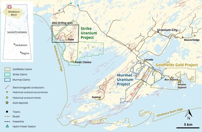 HALIFAX, NS, Dec. 7, 2022 /CNW/ - Fortune Bay Corp. (TSXV: FOR) (FWB: 5QN) (OTCQX: FTBYF) ("Fortune Bay" or the "Company") is pleased to announce analytical results from the 2022 maiden drilling program on the 100% owned Strike Uranium Project ("Strike" or the "Project"), located in northern Saskatchewan (see Figure 1).