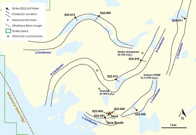Gareth Garlick, Technical Director for Fortune Bay, commented, "This was the very first time the extensive electromagnetic conductors on the Project have been drill tested and the analytical results confirm Strike's potential for shallow, high-grade uranium mineralization. The uranium intersected within S22-013 represents a new discovery of mineralization which is open in all directions. This result, located on the K Conductor, warrants priority follow-up in addition to the testing of numerous additional targets on the Project."