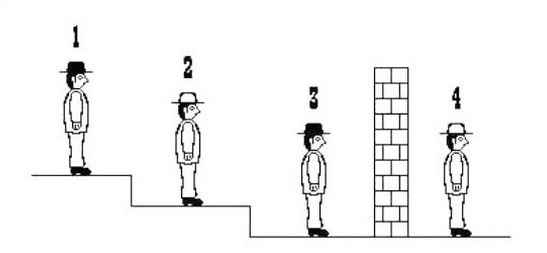 As shown in picture above there are 4 men looking forward. None of them can see back. There is a opaque wall between man number 3 and man 4 (1,2,3 cannot see pass the wall). Two of the men are wearing a black hat and two of them are wearing a white hat. Each man can see the color of the hat wore by the men in front of him. (1 can see 2,3 and 2 can see 3) but each person does not know the color of the hat he is wearing.