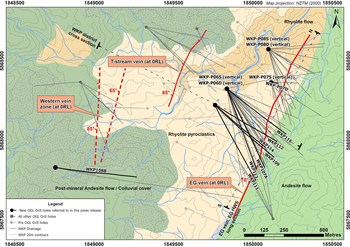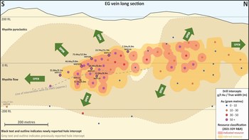 Since the March 2022 mineral resource estimate, 5,829 meters ("m") has been drilled at Wharekirauponga, predominantly on resource conversion of the EG Vein Zone, in addition to a further 679 m supporting geohydrological and geotechnical studies. Results are in-line with expectations and are anticipated to increase confidence in the geological and grade continuity of the deposit. Best intersections from the EG Vein include: