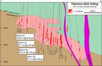 Figure 6: Long Section for the Palomino underground showing geology and drill holes completed to date (pre-2022 and 2022 with drill hole identification) (CNW Group/OceanaGold Corporation)