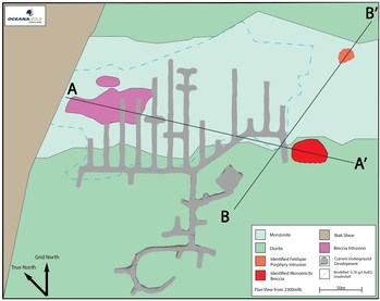 Figure 7: Plan view of underground development and lithologic units a 2,300 mRL (CNW Group/OceanaGold Corporation)