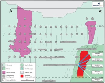 Immediately outside the known extents of underground copper-gold mineralisation and within 200 m of existing mine development, five high-potential copper-gold targets have been identified. Initial drilling of the first of five targets included 3,852 m and has returned positive results with two previously unknown zones of mineralisation being intersected; a copper-gold mineralised Feldspar Porphyry intersected in four holes at the northeast end of the mine and a cemented Monomictic (Eastern) Breccia in five holes. The plan view extent of the Feldspar Porphyry has been largely defined between 2,200 and 2,400 mRL and the Eastern Breccia between 2,200 and 2,300 mRL. However, mineralisation remains open vertically. Further drilling is being prioritised and is required to better define these targets and understand their full potential, however early results are very encouraging.