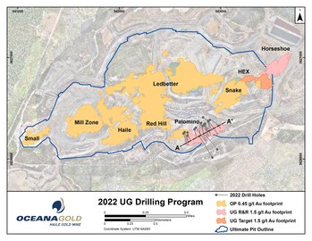 Figure 5: Plan view of the Haile Gold Mine with the reserve pit outline, open pit and underground mineralisation footprints and 2022 drill hole traces (CNW Group/OceanaGold Corporation)