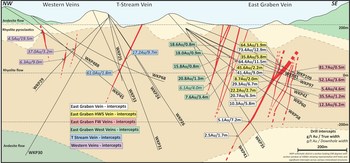 73.4 g/t Au and 133.0 g/t Ag over 12.9 m from 448.7 m, East Graben ("EG") Vein, (WKP109)52.8 g/t Au and 136.2 g/t Ag over 11.8 m from 445.7 m, EG Vein Zone, (WKP115)44.4 g/t Au and 97.8 g/t Ag over 9.8 m from 488.8 m, EG Vein, (WKP107A)17.7 g/t Au and 38.4 g/t Ag over 10.5 m from 405.3 m, EG Hanging Wall Splay, (WKP112)25.9 g/t Au and 42.9 g/t Ag over 5.2 m from 354 m, EG Hanging Wall Splay (WKP116)