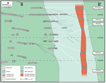 Figure 9: Long section showing the Eastern Feldspar Porphyry Intrusion (CNW Group/OceanaGold Corporation)