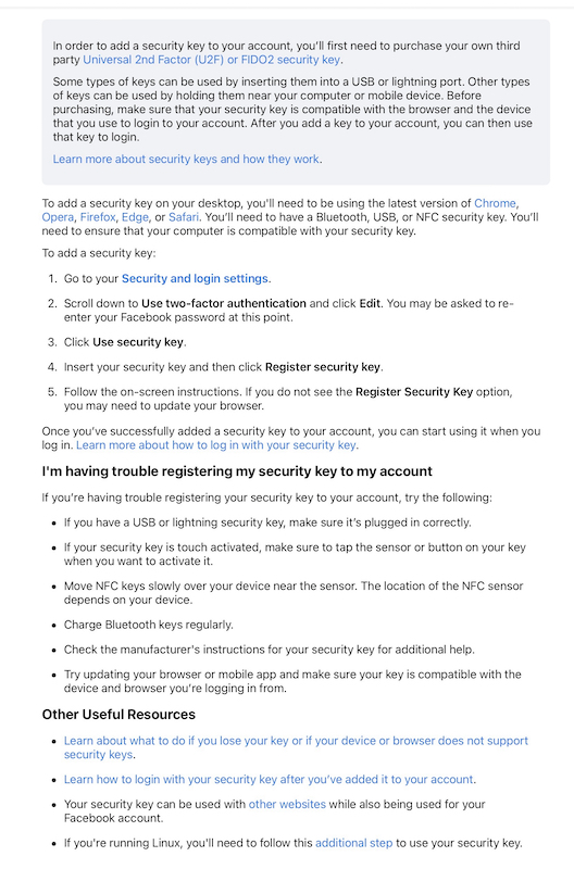 Description in Facebook settings about how to create a universal private security key, or U2F or FIDO2 authentication, as of this writing: