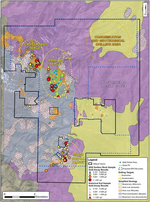 The proposed EPO covers 12,432 acres within Millennial's 17,612-acre land package at Wildcat (see Figure 1). Phase 1 drilling at Wildcat was confined to 5 acres of total surface disturbance under the current Notice of Operations, whereas the proposed EPO includes up to 400 acres of disturbance over several stages, beginning with 85 acres of disturbance in the first stage. The EPO will allow for expanded exploration drilling of new mineralized targets and resource infill drilling to further define the current mineral resource area. In preparation for the Mine Plan of Operations ("MPO"), the EPO also allows for water well drilling for hydrogeologic characterization and geotechnical test pits/trenches to characterize geotechnical conditions in the prospective mineral processing area.