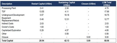 Estimated restart capital based on the PEA is US$20.9 million. The cost estimate includes refurbishing the process plant, upgrading the existing mining fleet, mine development, purchasing additional equipment and constructing a new tailings facility to support filtered tailings deposition.