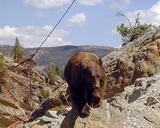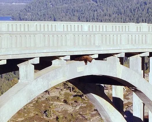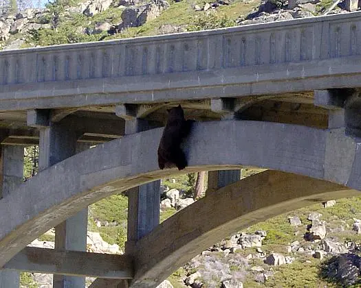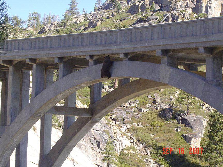 The bruin was walking across Rainbow Bridge on Highway 40 west near Donner Summit in the Sierra Nevada when at least two oncoming cars spooked it, causing it to jump over the bridge railing.
